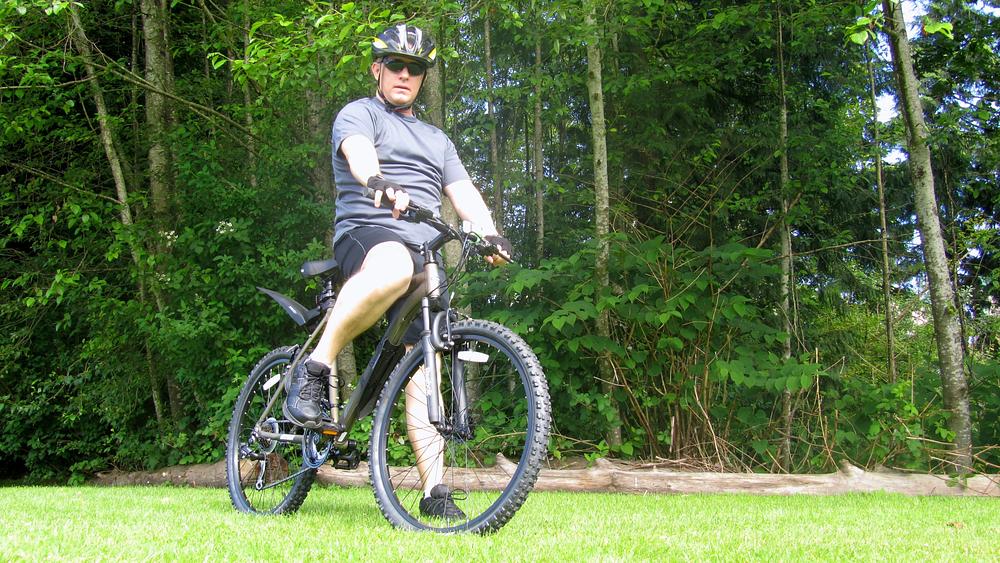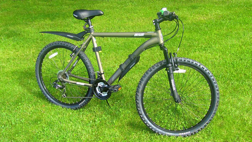 Olive Green Reebok Oregon Mountain Bike with Blackburn splashboards and very small front and back lights that are held on with special bendy wires that came with the lights. Green bell on left handlebar.