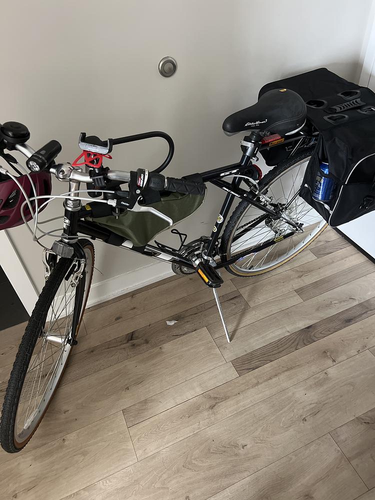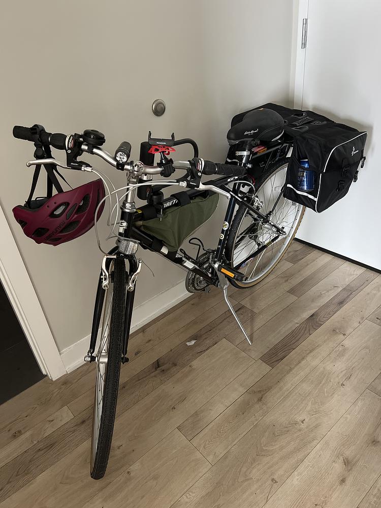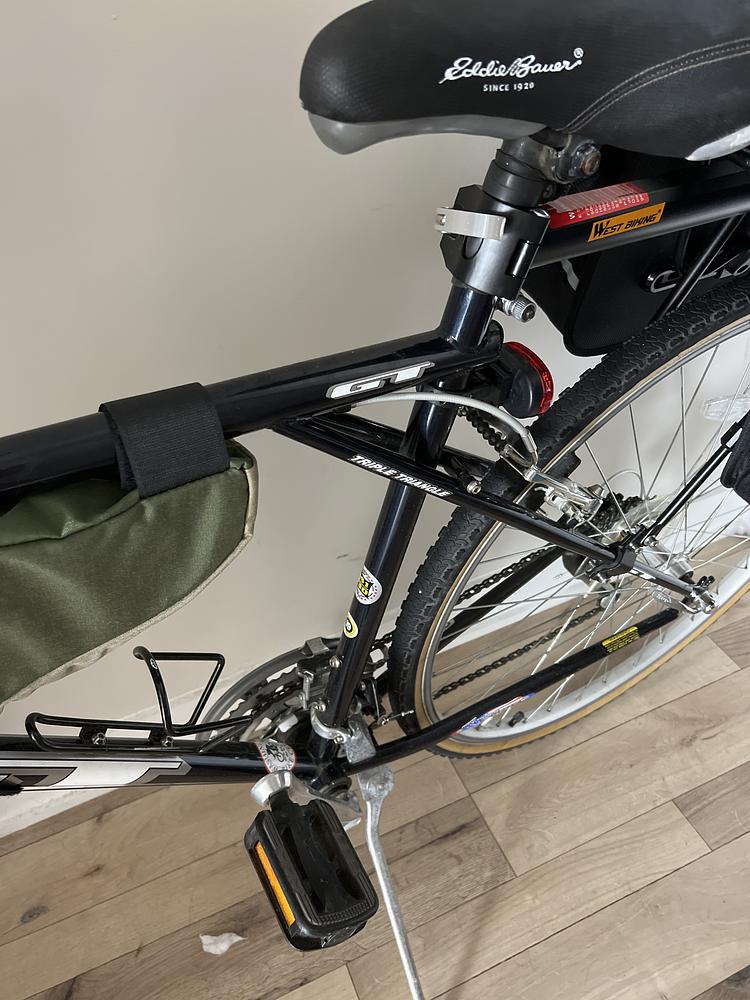 Double paniers and bike rack on the back, green hanging bag