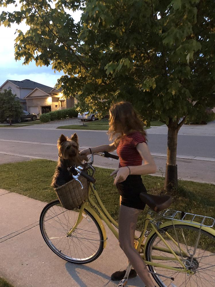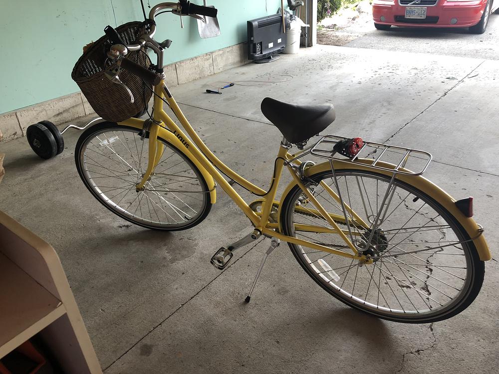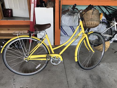 The bike is very easy to spot, it's unique, yellow cruiser with a purple lock at the back. It doesn't have a basket.