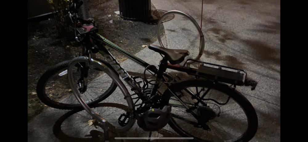 A green and black bike with Giant on the lower frame. Has a black metal sliding frame for holding bags on the back tire. Has a red phone holder and bell on the front.