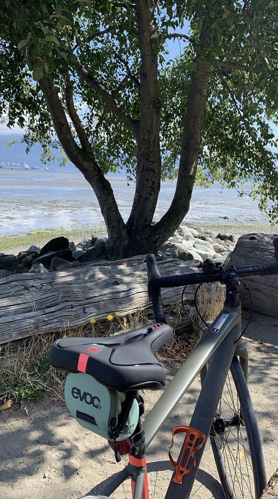 GREEN SPECIALIZED WITH ORANGE ACCENT - Blue EVOC pouch on the back seat