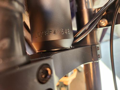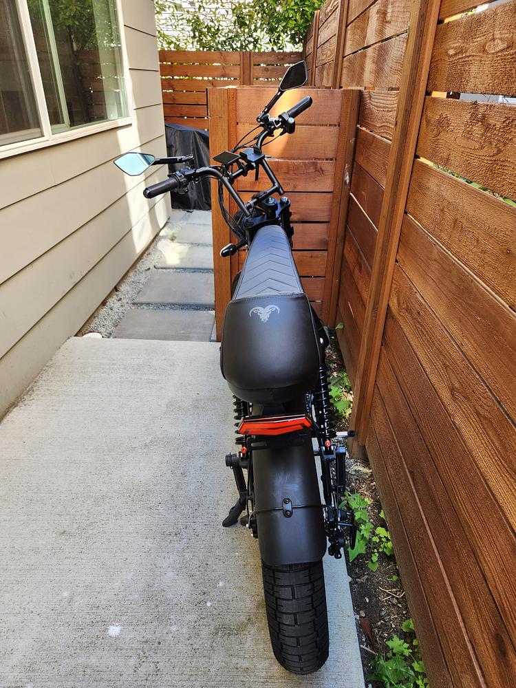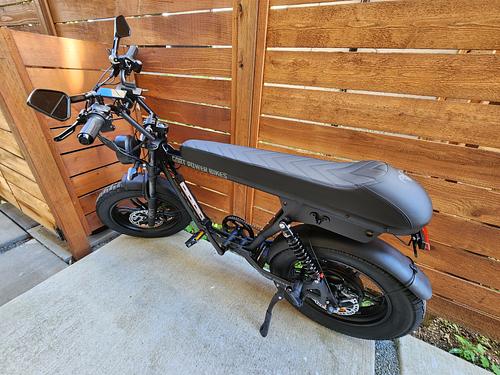 An All black bike. It has a really long seat like a motorbike with a sissy bar on the back (not in photo). The logo is a goat head. May still have fabric-covered chain lock around frame.