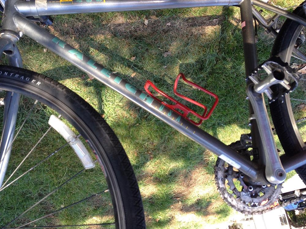 Rear rack (gray) Water bottle holder (red) Fender (black, new, Planet Bike) Bullhorn handlebars (black) Panniers (black, old with repairs in duct tape)