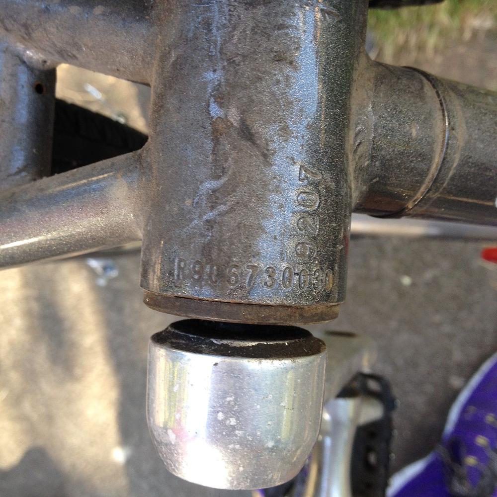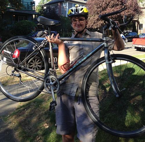 Raleigh bike with gray-brown frame. Unusual black handlebars (bullhorn), gray rear rack and red water bottle holder. Brooks saddle in black. When stolen had an older pannier set in black with gray duct tape repairs.