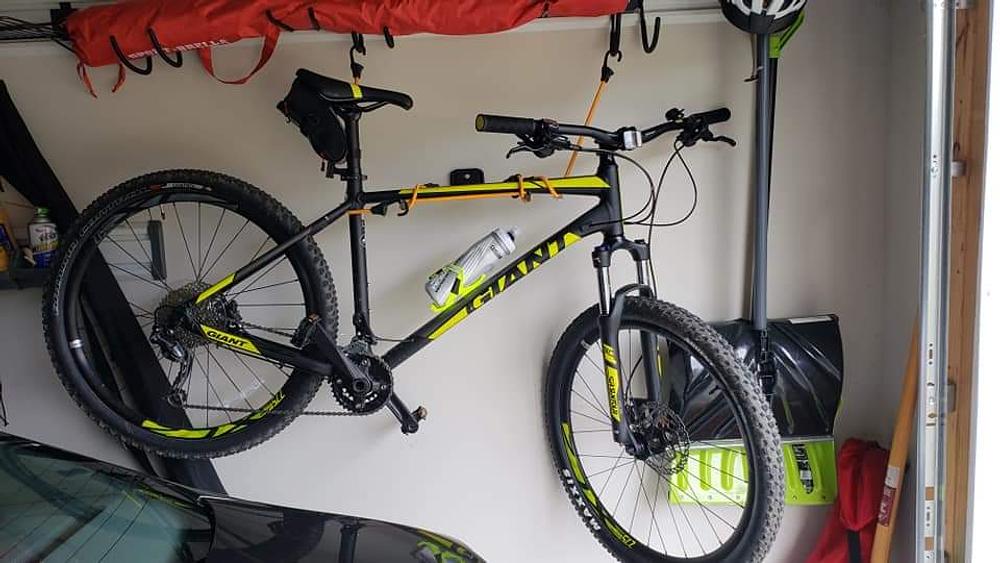 Black and bright Yellow, wheel treads on back wheel are backwards to front wheel, Bright Yellow Water Holder, Black and Red Trim bag under seat w/ Multitool.