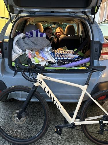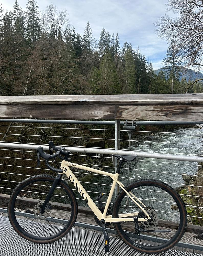 Off white, Canyon Grail bike. Black seat and handle bars, with a kickstand, and a little bit of ripping on the right side of the handlebar tape