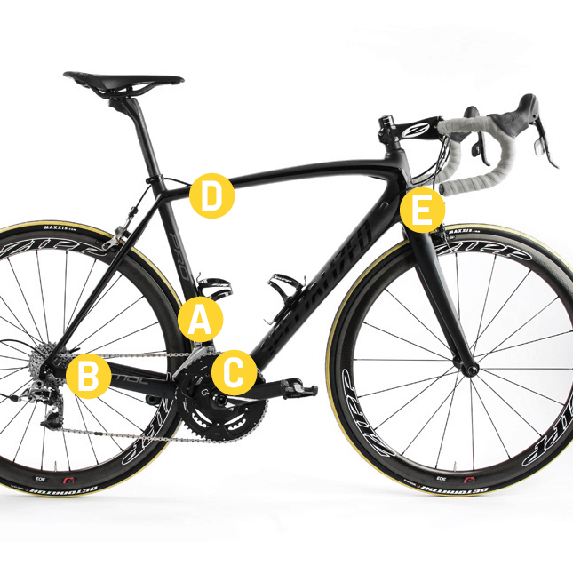 - See if it's on the seat tube (A). That's the long tube that runs from the bottom bracket to the seat. If it's there, the serial number is usually near the top.